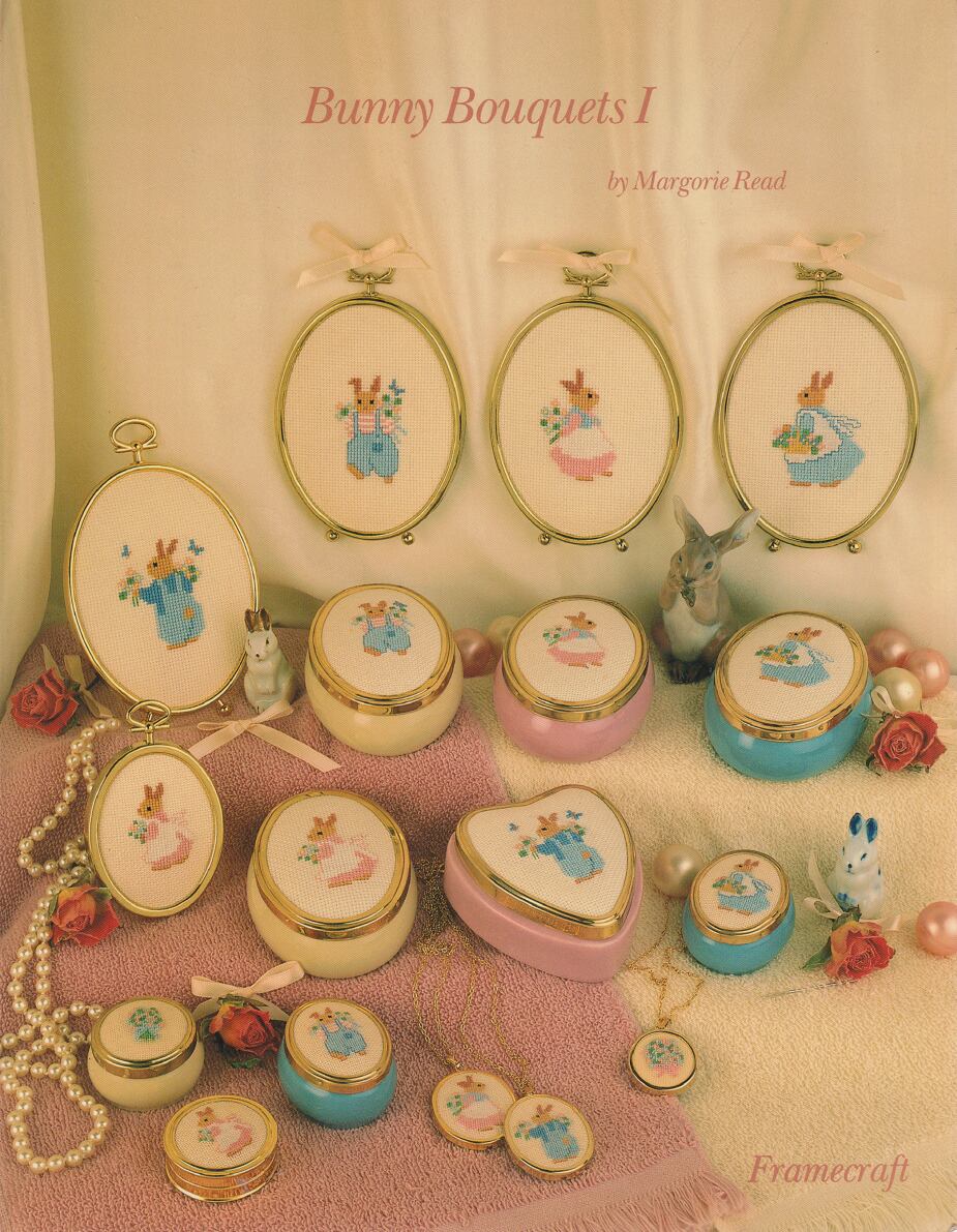 おしゃれをしたかわいらしいウサギさんの図案が5点、ブーケの図案が2点の計7点収録されています。作品の完成写真はカラーで掲載されており、図案部分はモノクロとなります。DMC,Anchorの色番号がついています。