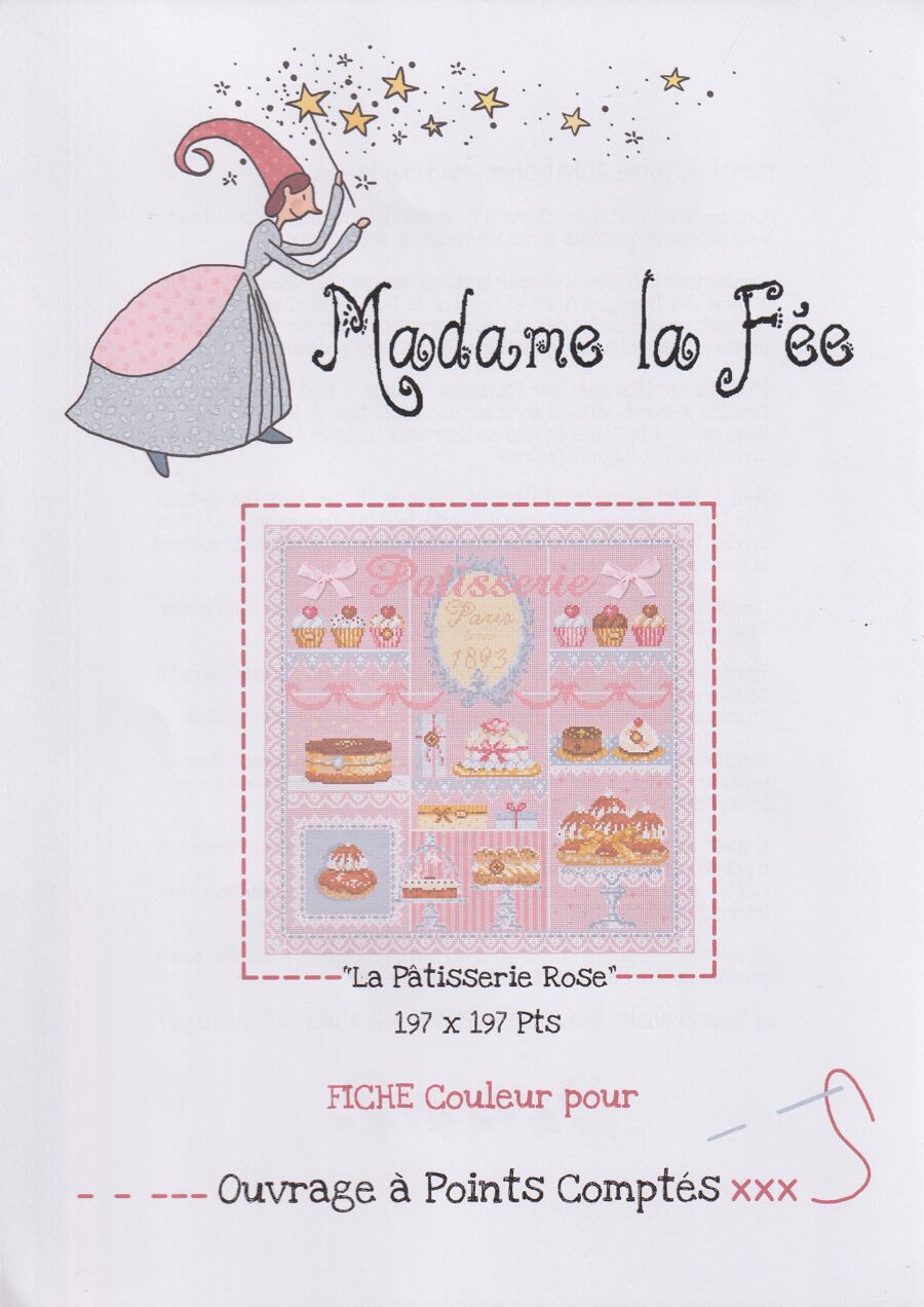 かわいいピンク色の背景に描かれているのは、おいしそうなお菓子たちです。カラーの完成図は一枚目の描かれ、カラーのチャートがその他の紙に掲載されています。DMCの色番号つきです。