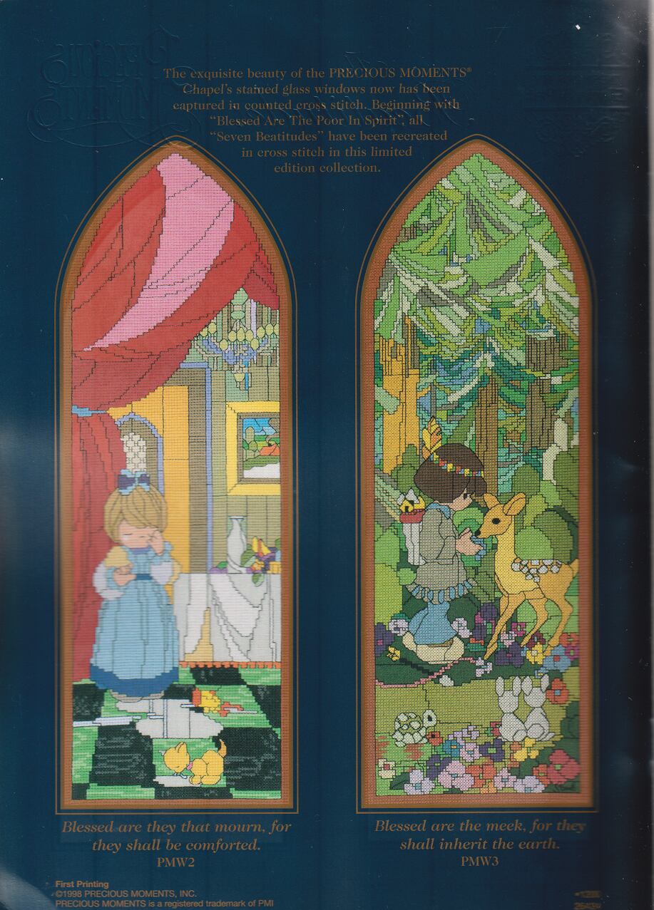 イエス様の至福の教えを表す、少女たちの七つのシーンをチャペルの窓のような形にデザインしています。図案は全部で7点あり、イラストが、表紙・表紙裏、裏表紙、裏表紙裏にカラーで掲載されています。対応するチャートがモノクロで中に収録されています。DMCの色番号つきです。