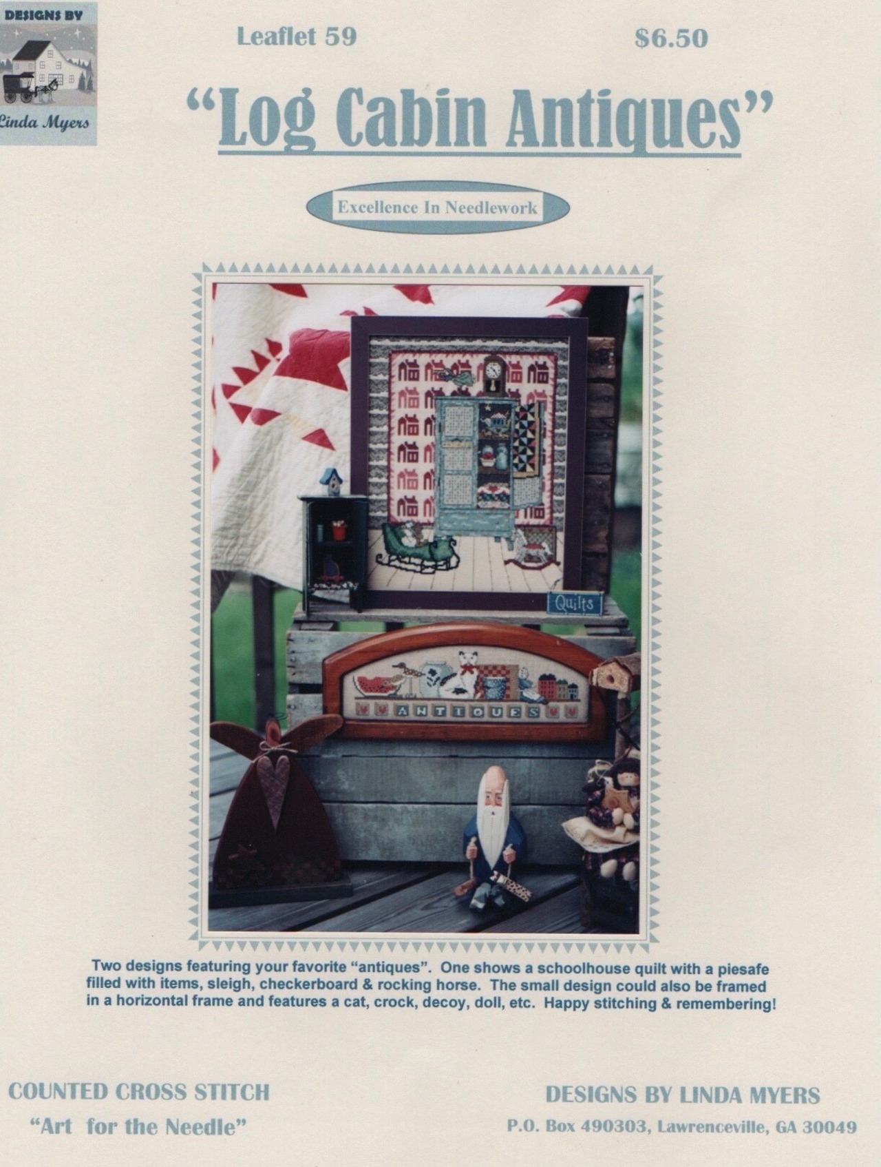 どこか懐かしさを感じる、丸太小屋の中の冬めいたインテリアがイメージされたとてもあたたかいデザインの2点のサンプラー図案が掲載。