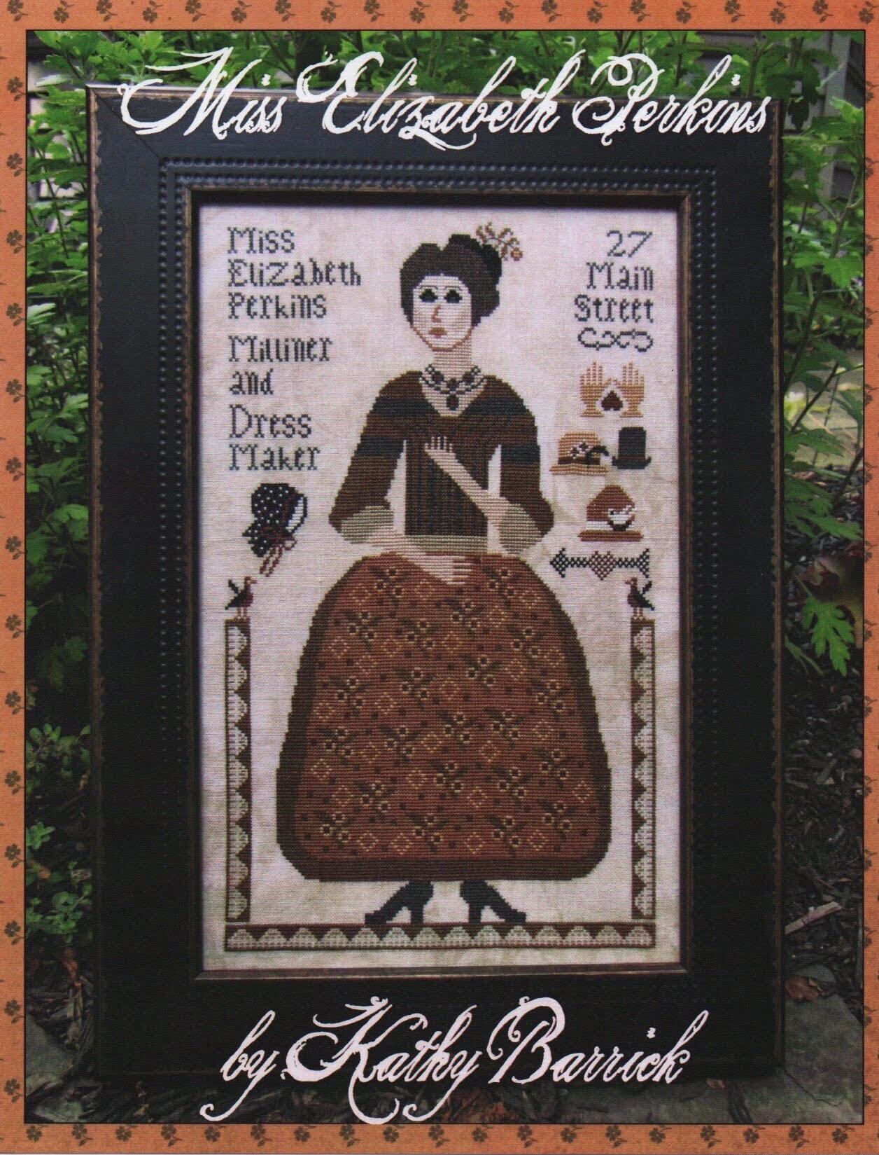ミス・エリザベスをモチーフとしたサンプラーチャート。シックな色合いと素敵な柄のドレスが魅力的。