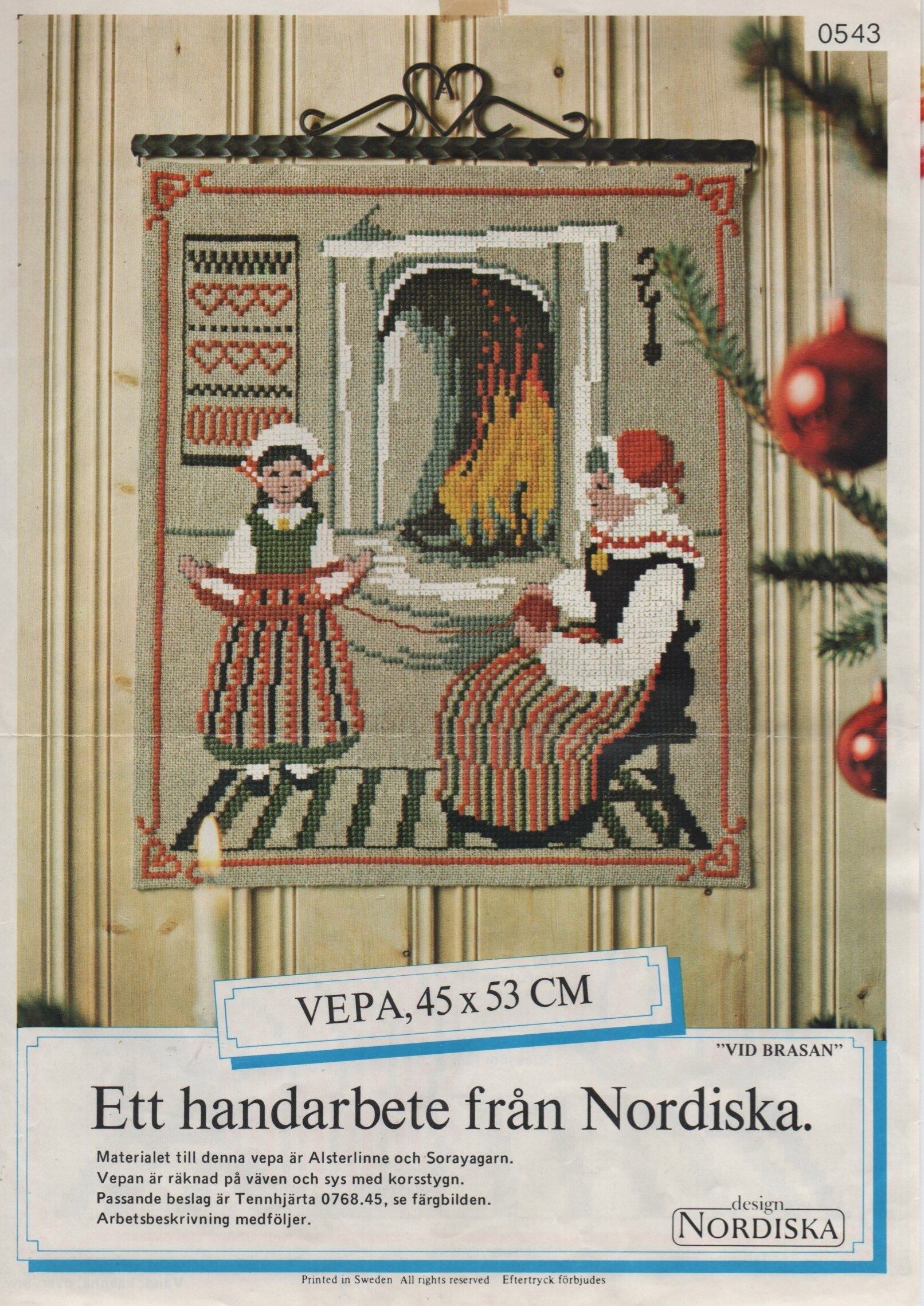 大きな暖炉のある部屋と民族衣装の親子がモチーフ。