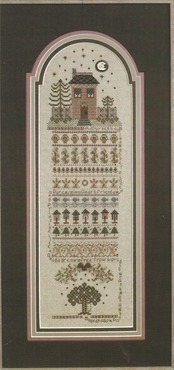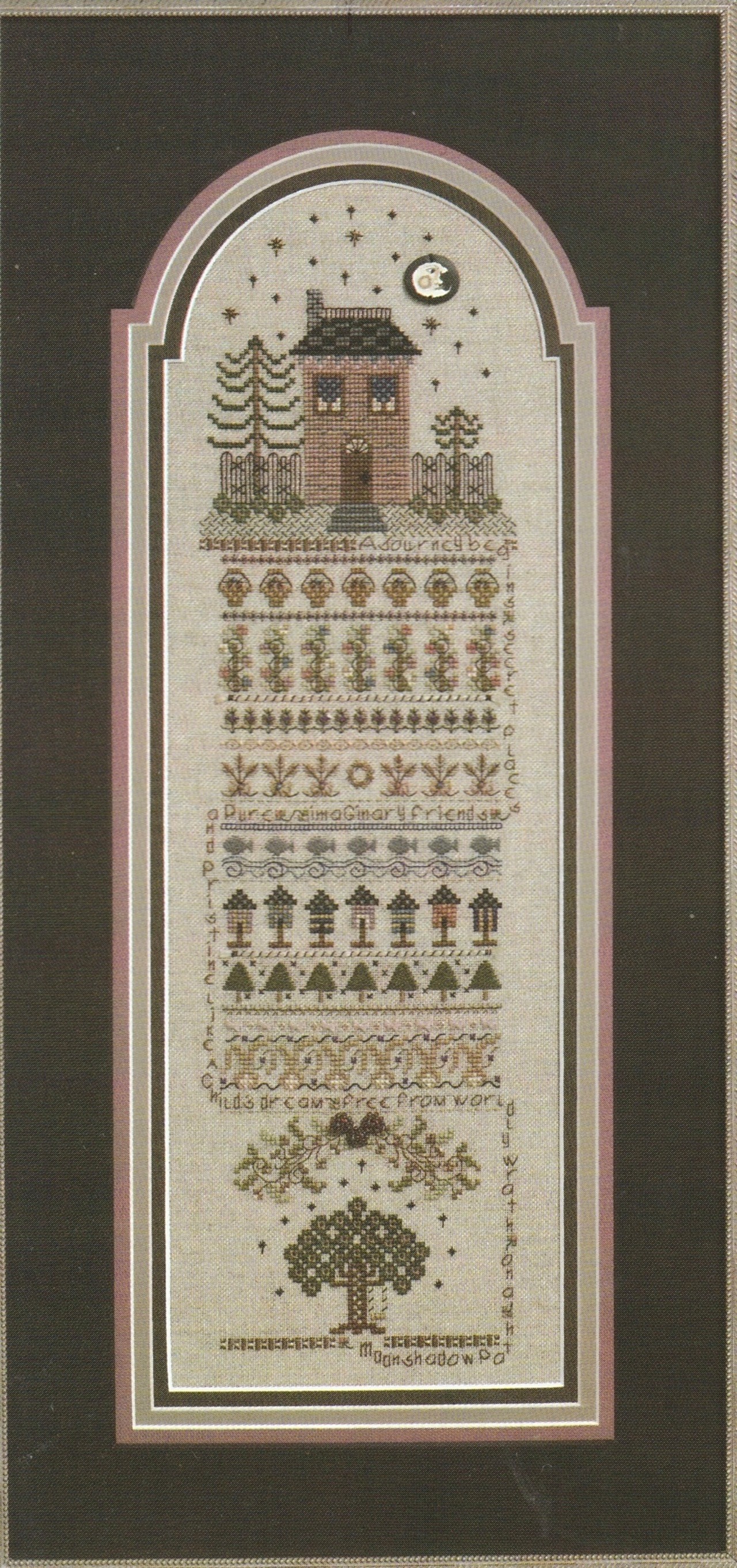 月の明かりに照らされた小道をデザインした、縦長のかわいいクロスステッチ図案。DMCとANCHORの糸指定あり。ステッチカウント、255×69。お月さまのチャームとビーズ類が付属しています。